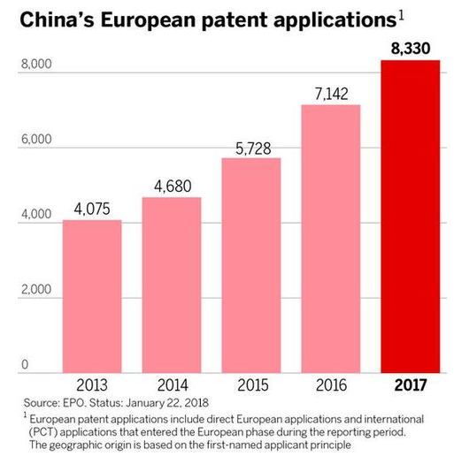 歐洲專利局稱,2017年,歐洲專利局共收到16.6萬份國際專利申請,比2016年增長3.9%;中國遞交的專利申請數(shù)量高達(dá)8330項(xiàng),比前一年增長16.6%,中國首次取代瑞士成為歐洲專利局前五大申請國家之一,僅次于美國、德國、日本和法國。
