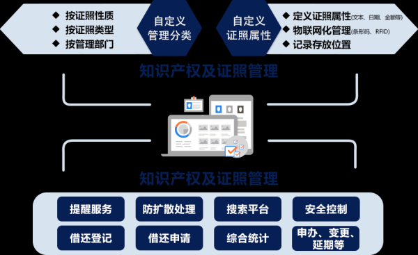 提供類似于圖書館的借閱與歸還登記功能,全面把控知識產(chǎn)權(quán)及證照入管理。