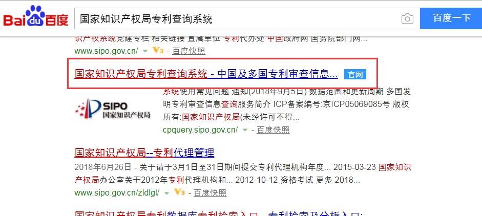 1、百度搜索【國(guó)家知識(shí)產(chǎn)權(quán)局專利查詢系統(tǒng)】。
