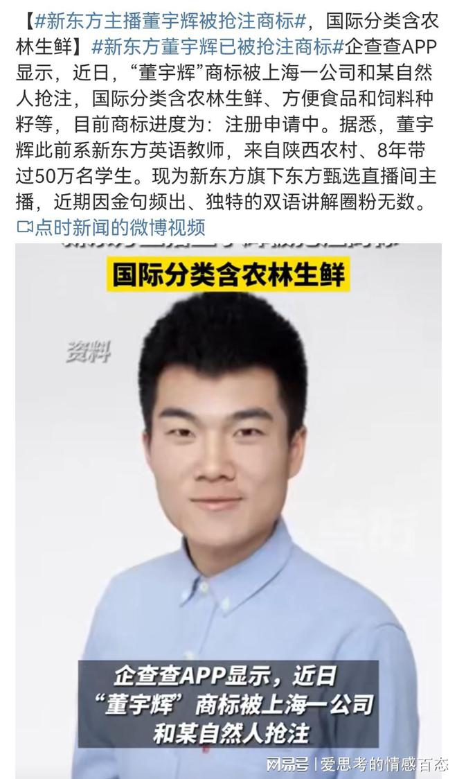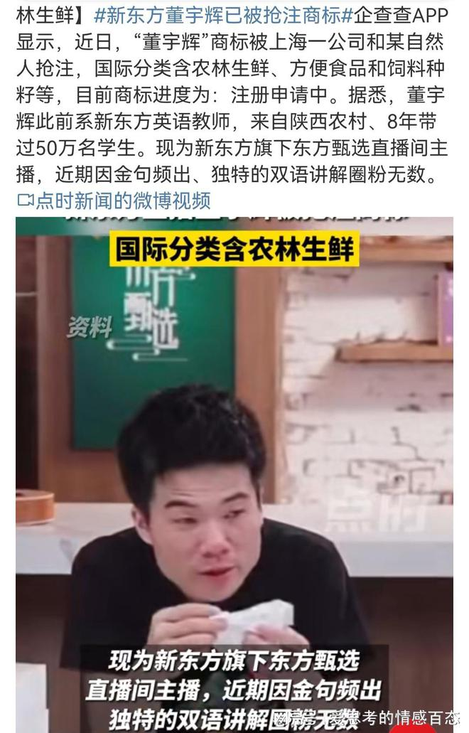 新東方主播董雨欣被搶出商標(biāo),這也是令人想象不到的事情,主要是因為這種帶貨方式讓董宇輝火了一把。在國際商標(biāo)分類中含有農(nóng)林生鮮以及方便食品和飼料種子這些商標(biāo)目前的進度都是注冊申請中。了解過董雨輝的人都知道,此人是新東方的英語教師,來自于陜西農(nóng)村8年已經(jīng)帶過50萬名學(xué)生現(xiàn)在成為新東方旗下的一名直播間,主播因為金指頻出以及獨特的雙語帶貨,在講解的過程中圈粉無數(shù)。