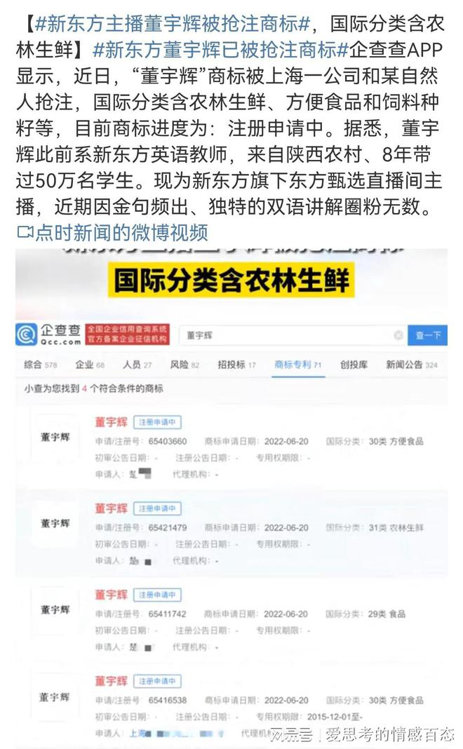 在6月29號的時候,通過國家知識產(chǎn)權(quán)官網(wǎng)的顯示,會發(fā)現(xiàn)最近比較火的新東方主播董永輝商標(biāo)被眾多企業(yè)搶注商標(biāo),其中包括上海潤騰實業(yè){},還有自然人楚客坤申請注冊。在國際分類中主要包含的一些國際商標(biāo)有茶,巧克力,糕點,甜食,通過相關(guān)的查詢方式,這些商標(biāo)以及詳情顯示,而且有人正在申請商標(biāo)等待處理,并且無法查詢到詳細(xì)的信息。董宇輝是新東方旗下最新的甄選主播,因為用自己的知識去帶貨爆紅,所以影響力比較大,并且在東方甄選的直播間粉絲能夠達(dá)到2,000萬,所以帶貨是比較多的。