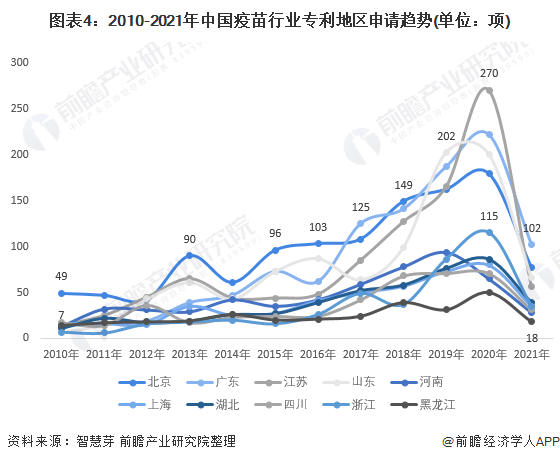 趨勢(shì)方面,2010-2020年,北京、江蘇、山東和廣東“你追我趕”。2020年,江蘇省的專利申請(qǐng)數(shù)量最多,達(dá)到270項(xiàng);北京在2021年進(jìn)行反超,截止2021年8月,北京市專利申請(qǐng)數(shù)量達(dá)到102項(xiàng)。其余省份在2010-2020年的疫苗專利申請(qǐng)量差距不大。