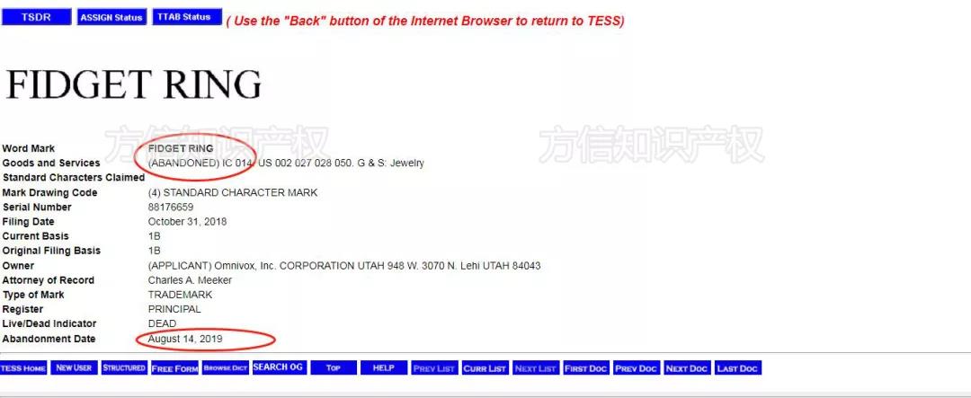 但小信還是發(fā)現(xiàn)早在 2019 年甚至更早的 1999 年里都有人申請(qǐng)了 “ fidget rings ” 14 類商標(biāo),但最終因?yàn)槊枋鲂择g回。