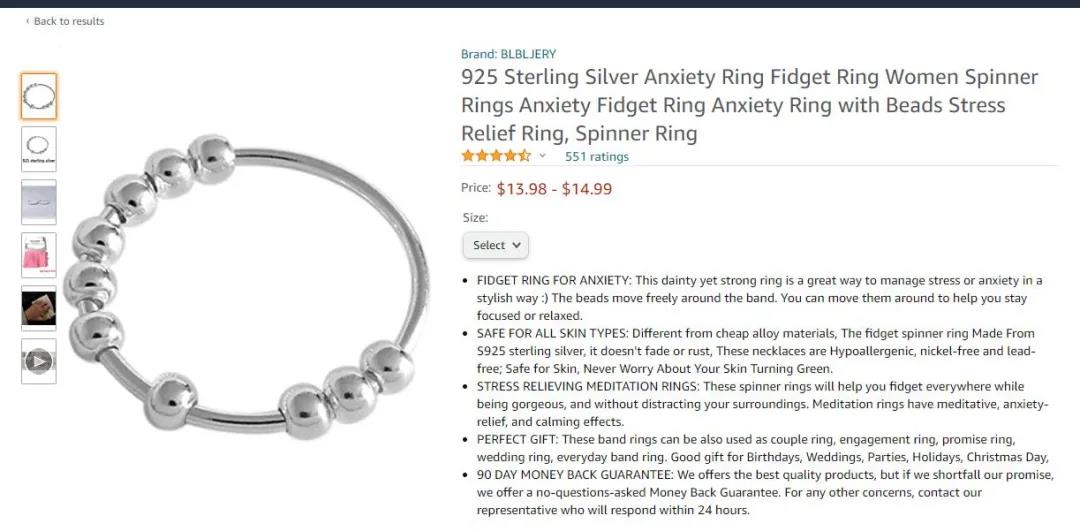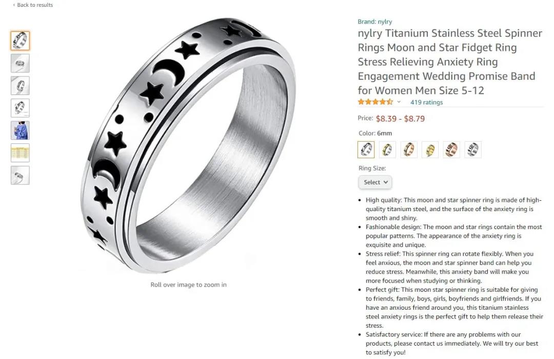 圖中亞馬遜產(chǎn)品 3 中的解壓戒指,小信覺得最大的特色就是星星和月亮的造型,無論是簡(jiǎn)單大氣的造型還是浪漫的搭配,都一定會(huì)深受女性買家喜歡。